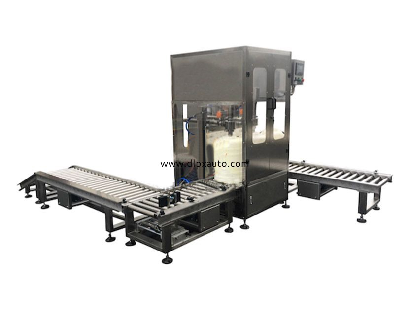 高灌全自動灌裝壓蓋線工作流程:人工放桶-自動滾筒輸送-自動定位-自動稱重灌裝-自動滾筒輸送。