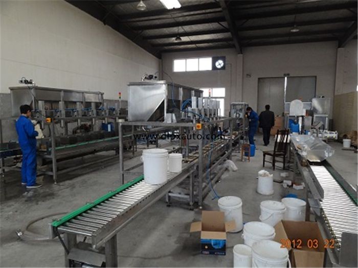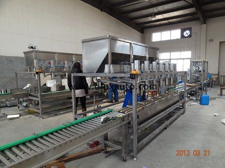 手紅放桶一自動(dòng)輸送一6頭自動(dòng)定位稱重灌裝 自動(dòng)理蓋一 自動(dòng)旋蓋一 重 量檢測(cè)一-自動(dòng)貼標(biāo)- -自動(dòng)噴碼一輸送到碼垛位一 半自動(dòng)碼垛- 托盤輸送