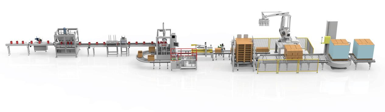 1-10L方桶、圓桶全自動(dòng)整線 組成部分:人工放桶(自動(dòng)理桶機(jī))、自動(dòng)打印貼標(biāo)機(jī)、全自動(dòng)稱重液體灌裝機(jī)、自動(dòng)上蓋壓蓋 機(jī)、自動(dòng)開箱機(jī)、自動(dòng)裝箱機(jī)、自動(dòng)封箱機(jī)、箱自動(dòng)貼標(biāo)機(jī)、自動(dòng)供棧機(jī)、機(jī) 器人碼垛機(jī)組、在線圓盤式纏繞、整線