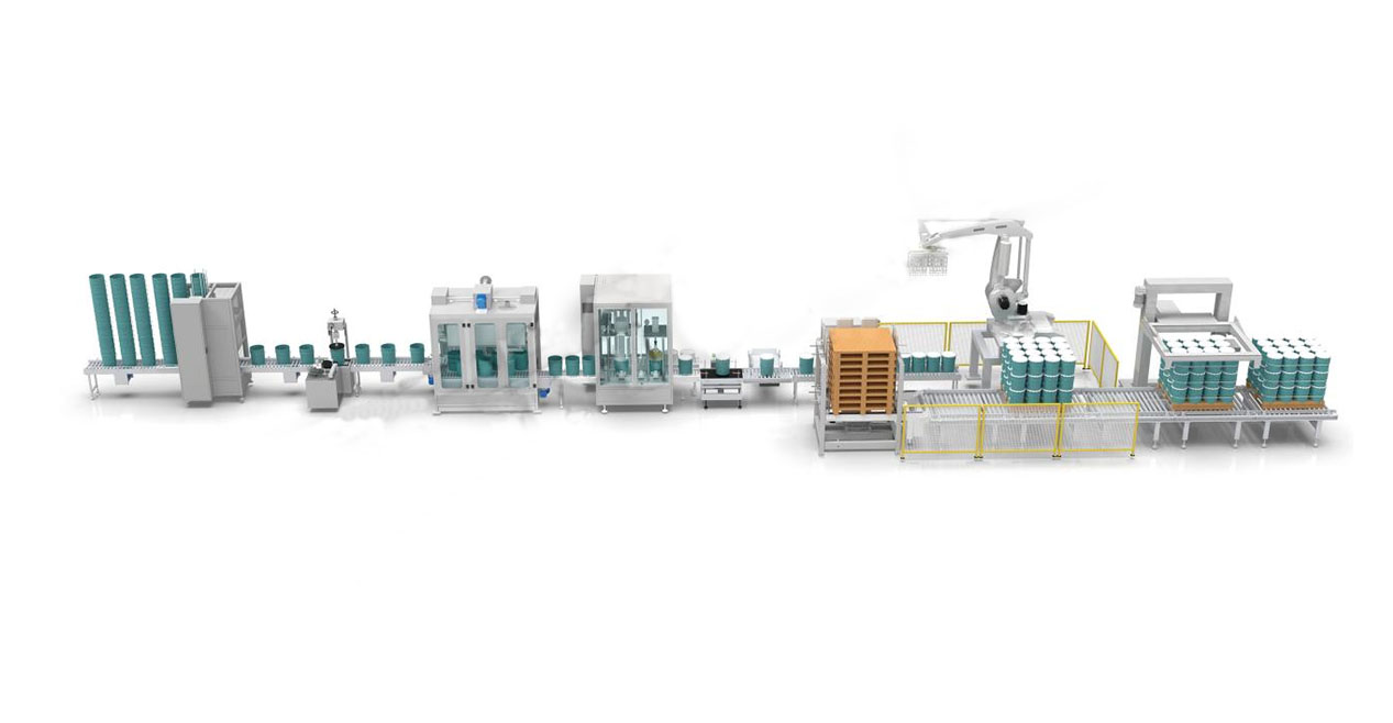Manual barrel stacking (barrel stacking elevator), automatic vertical barrel separator, automatic barrel printing and labeling machine, automatic weighing filling machine, automatic cap feeding and capping machine, online checkweighing and rejection, drum positioning, automatic stacking machine, robot palletizing unit, automatic horizontal strapping machine
