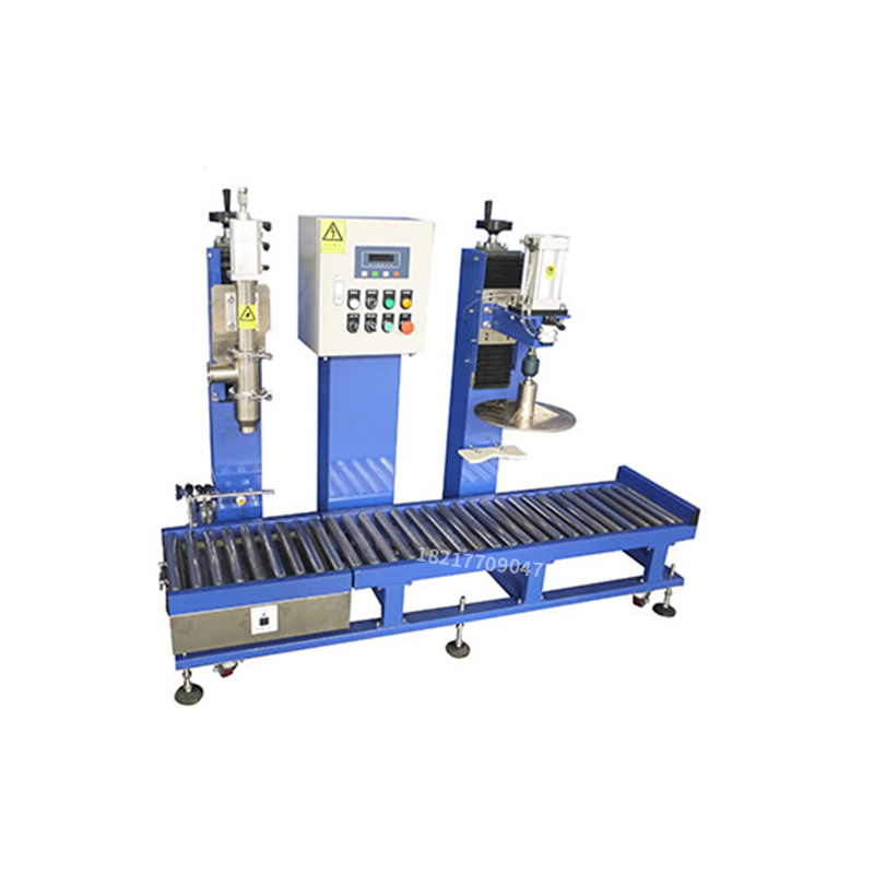 開機---人工放桶至秤臺快速定位對口--系統(tǒng)自動偵測桶位、灌槍自動插入桶口---自動去皮---自動打開灌槍及球閥組開始灌裝---大、中、小、微量四段式灌裝---到達(dá)目標(biāo)值--灌槍自動關(guān)閉并升至 桶外---人工移桶至夾蓋區(qū)---自動氣動夾蓋---自動推桶至?xí)捍鎱^(qū)---人工碼垛。