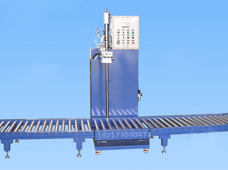 設(shè)計(jì)獨(dú)特的灌裝頭裝置易于操作,灌注快速、;并且大限度地保證灌注完畢時(shí)殘液的滴漏。操作時(shí),操作者先將空桶開蓋放置在空桶暫存區(qū)!輸送線自動(dòng)輸送至灌裝工位,液體灌裝機(jī)自動(dòng)對(duì)口。然后打開灌裝閥門,地雙速灌裝;灌裝結(jié)束,灌裝秤頭自動(dòng)提升至桶外,滴漏盤自動(dòng)接至灌裝頭底部灌裝完成,輸送線啟動(dòng)自動(dòng)將成品桶輸送至鎖蓋區(qū),人工鎖蓋完成自動(dòng)輸送至成品區(qū),叉車叉走成品桶整個(gè)灌裝流程結(jié)束!