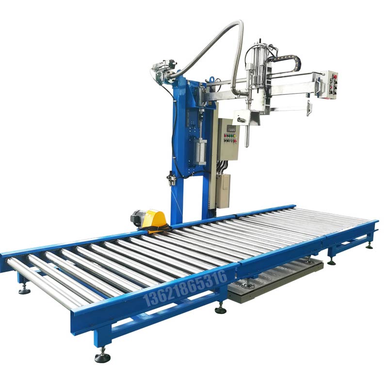 開機---人工放桶至秤臺快速定位對口--系統(tǒng)自動偵測桶位、灌槍自動插入包裝桶底部--自動去皮--自動打開灌槍及球閥組開始灌裝--大、中、小、微量四段式灌裝---到達目標值--灌槍自動關閉并升至桶外---灌裝完成。