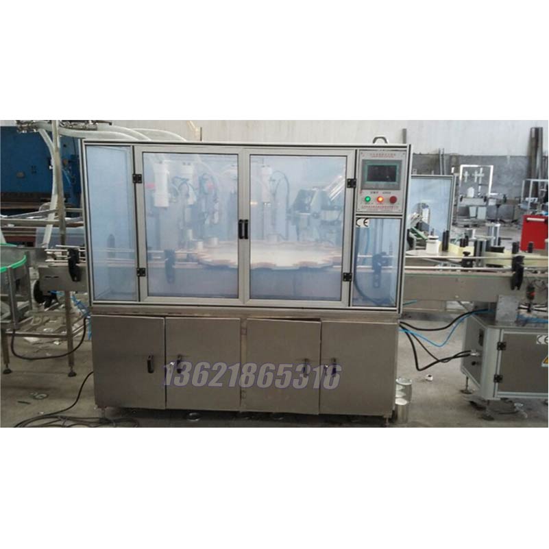 全自動滴管蓋瓶灌裝旋蓋機(jī)結(jié)構(gòu)上包括了轉(zhuǎn)盤進(jìn)瓶、自動灌裝、自動噴頭蓋(滴管蓋)、旋蓋、貼標(biāo)、收瓶這幾個主要工步的裝置。采用PLC控制,全自動性強(qiáng),能節(jié)省人力成本,適合大中型企業(yè)采購。