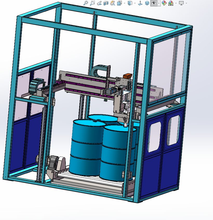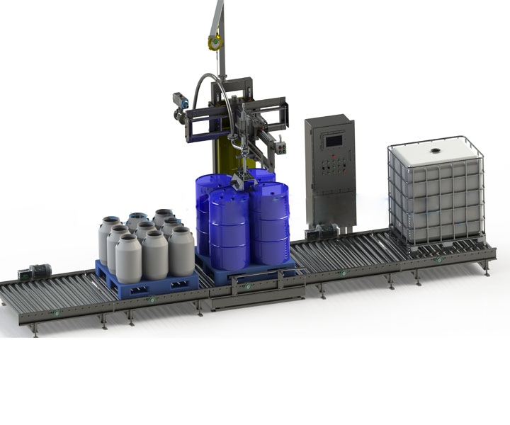 Fully automated machine for weighted and production of 20 to 1.500 liter drums, cans, barrels and IBCs on pallets.The model is designed for high filling productions featuring a high level of automatio