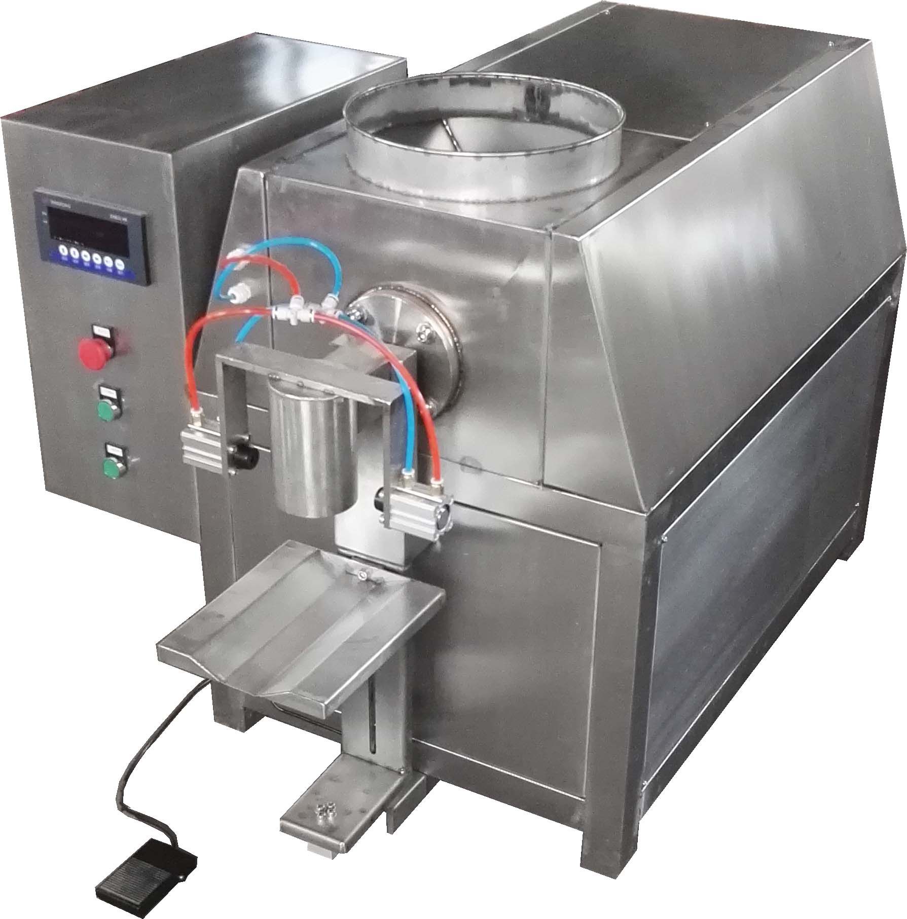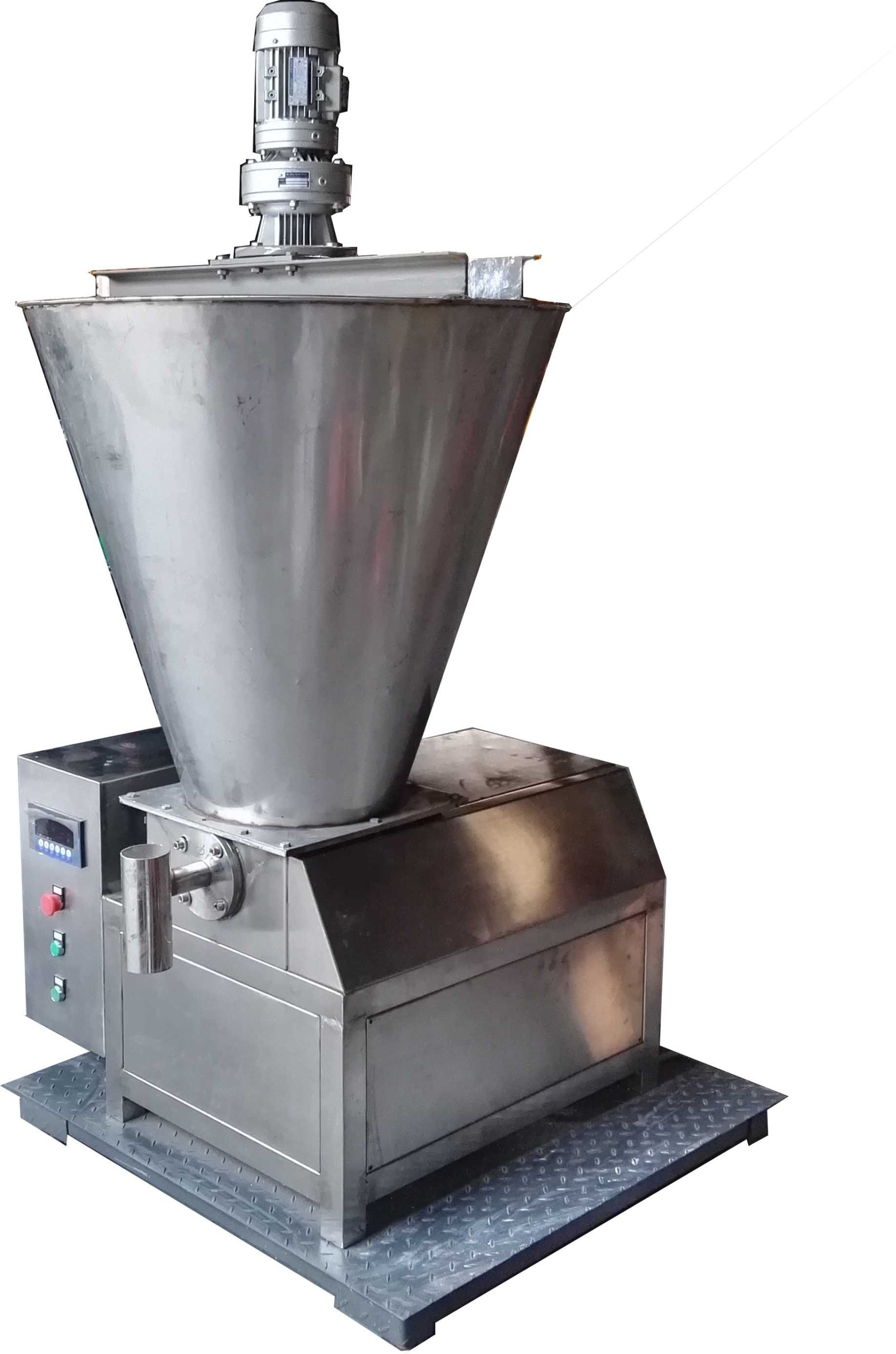 參見圖(一)將小包裝袋套在加料嘴上,腳踏“加料/停止”開關(guān),這時破拱電機緩慢轉(zhuǎn)動,保證下料暢通。加料螺旋高速轉(zhuǎn)動迅速將物料灌入袋中,待加料快到設(shè)定值時,加料螺旋進行減速慢加,到設(shè)定值時,加料停止。誤差<0.3%。