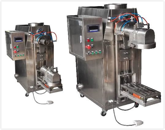將閥口包或敞口袋裝袋套在加料嘴上,按動“允加”按鈕,這時壓袋氣缸開始工作并壓住袋口,控制器將包裝袋重量自動去除,破拱電機(jī)緩慢轉(zhuǎn)動,保證下料暢通。加料螺旋高速轉(zhuǎn)動迅速將物料灌入袋中,隨袋中空氣一起溢出的粉塵通過吸塵器由除塵器吸走,振動裝置同時啟動將托盤上袋中物料振實(shí)充滿袋角。待加料快到設(shè)定值時,加料螺旋進(jìn)行減速慢加,到設(shè)定值時,加料停止。誤差<0.3%。這時壓袋氣缸松開袋口,翻袋氣缸將托盤翻轉(zhuǎn),將物料翻倒在皮帶輸送機(jī)上及時送出。
