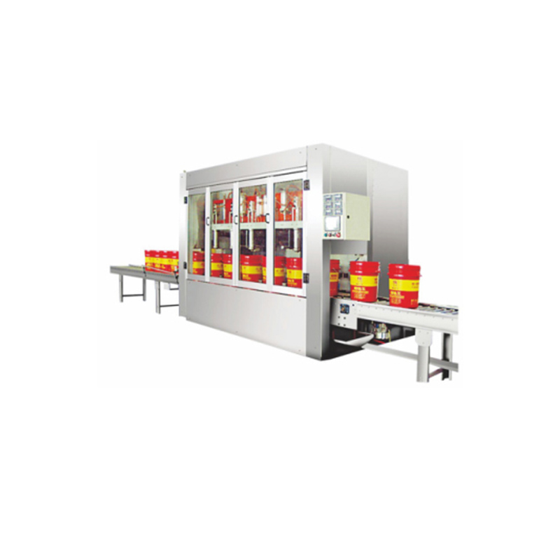 工作流程:空桶自動輸送 - 空桶撥至稱重區(qū)同時自動對桶口 - 空桶自動除皮 - 自動定量灌裝 - 自動推重桶至鏈板輸送線 - 自動上蓋同時自動鎖蓋  - 重桶輸送到重桶待提區(qū) - 人工提走即完成